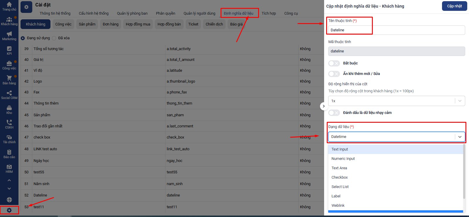 Getfly CRM hỗ trợ nhiều kiểu dữ liệu khác nhau trong phần Định nghĩa dữ liệu, giúp người dùng linh hoạt tạo thêm các trường thông tin tùy chỉnh (custom field) phù hợp với nhu cầu quản lý thực tế.