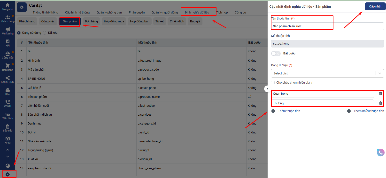 Bước 1: Vào Cấu hình → Định nghĩa dữ liệu → Sản phẩm → Thêm mới: tạo thêm một trường dữ liệu phân loại (ví dụ: “Mức độ quan trọng” hoặc "Sản phẩm chiến lược).