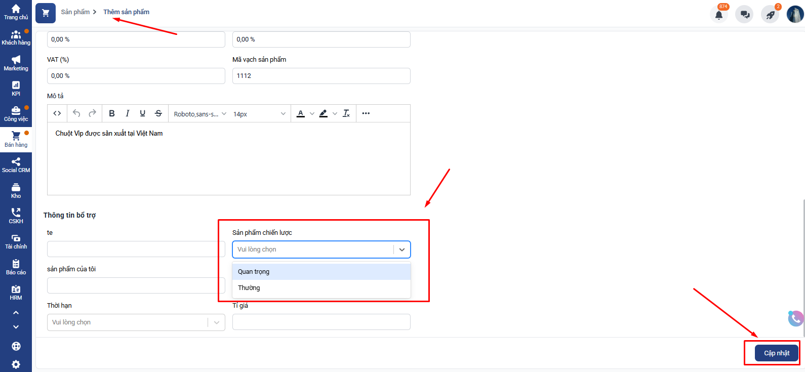 Bước 2: Khi thêm mới hay sửa sản phẩm bạn Gắn giá trị “Quan trọng” cho các mã hàng cần theo dõi.
