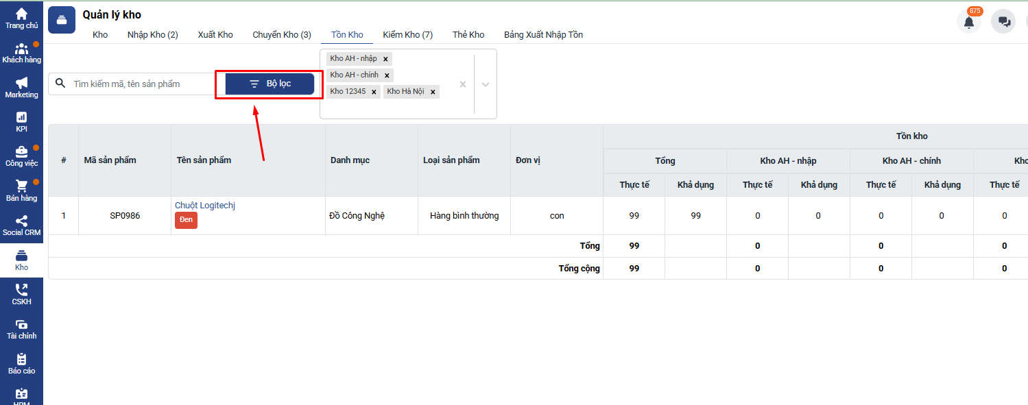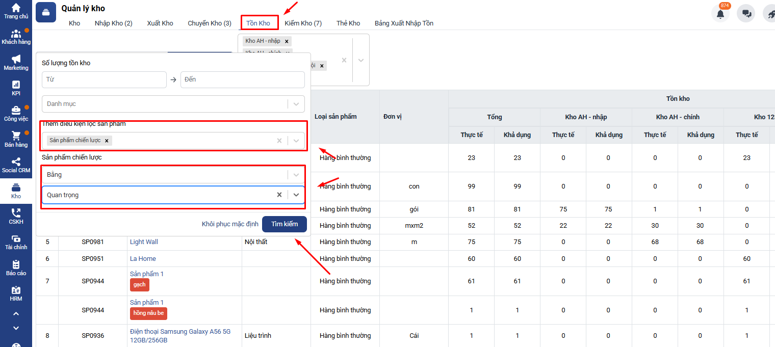 Bước 3: Khi vào Tồn kho, chọn Kho và Bộ lọc → Mức độ quan trọng → Quan trọng để chỉ hiển thị danh sách các mã hàng này.