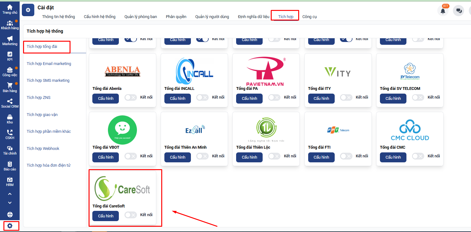 Bước 1: Bạn vào mục Cài đặt → chọn Tích hợp → Tích hợp tổng đài → Chọn mục Tổng đài Caresoft