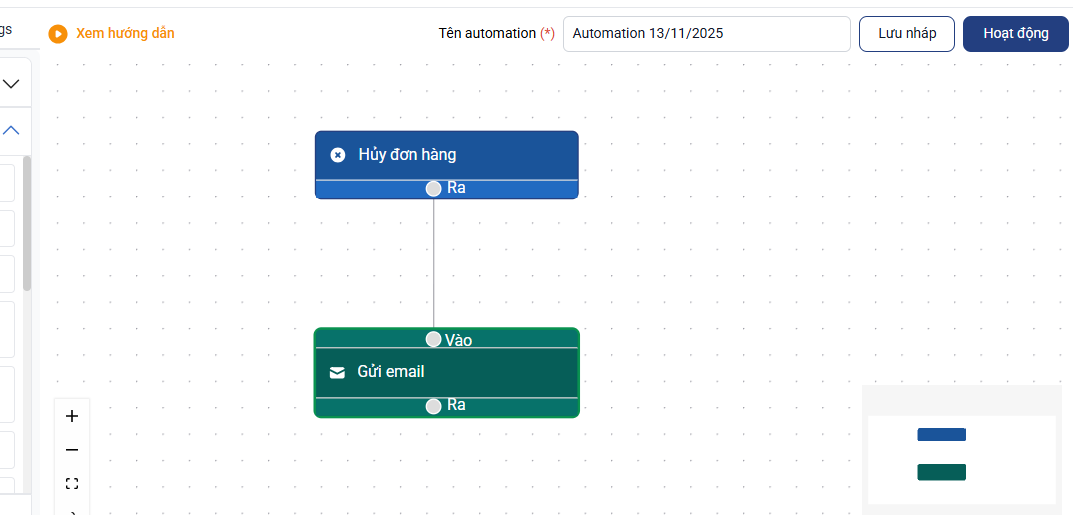 Để tạo automation gửi mail thông báo đến tài khoản tạo đơn hoặc tài khoản thực hiện đơn hàng khi đơn hàng bị hủy, các bạn thao tác như sau