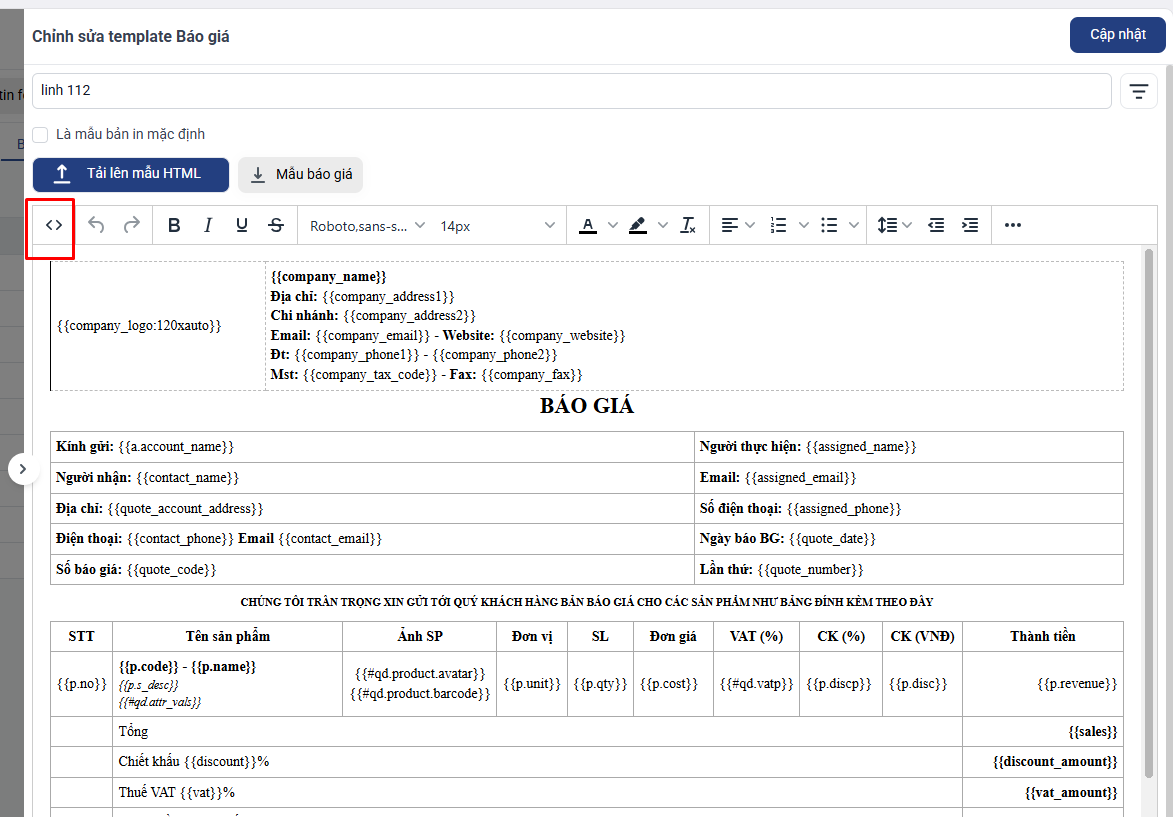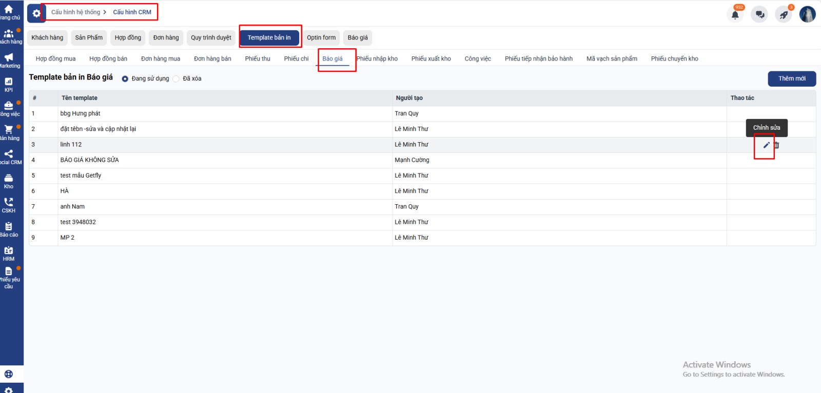 Bước 1: Vào Cài đặt → Cấu hình CRM → Template bản in → báo giá → chọn bản in cần chỉnh sửa → Ấn vào bút chỉnh sửa :
