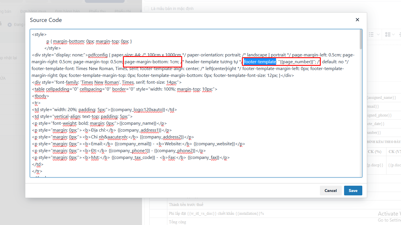 Bước 2: Vào biểu tượng <> để mở code bản in → Sau khi hiển thị màn hình code thì tìm tới đoạn "footer-template" để bổ sung cái biến "Số Trang" ({{page_number}}) . Và thêm mục page-margin-bottom: 1cm.