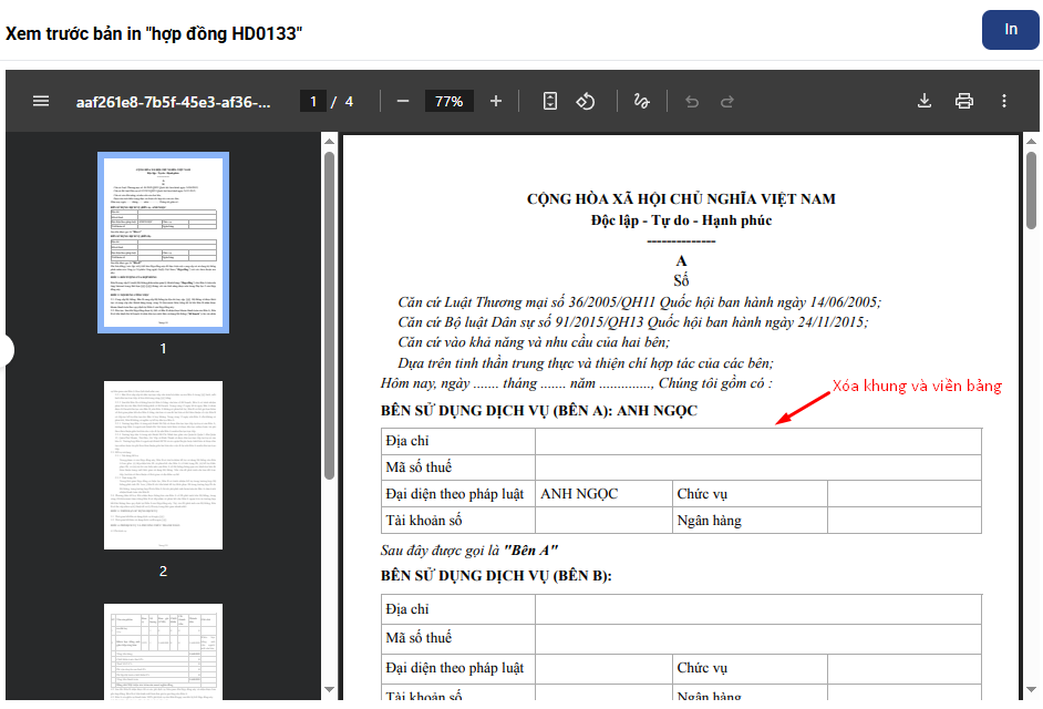 Hướng dẫn xóa khung và viền bảng khi sử dụng template bản in trên Getfly.