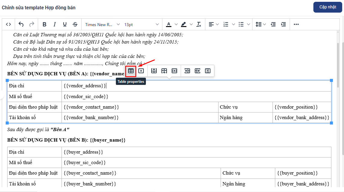 Truy cập Cài đặt → Cấu hình CRM → Template bản in → Chọn mẫu tempalte cần thêm mới hoặc chỉnh sửa → Chọn bảng cần xóa khung và viền → Chọn Table properties