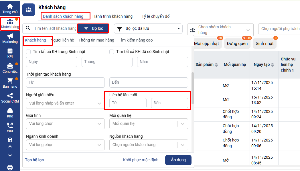 Bước 1: Truy cập Danh sách khách hàng → Bộ lọc → Khách hàng → Liên hệ lần cuối