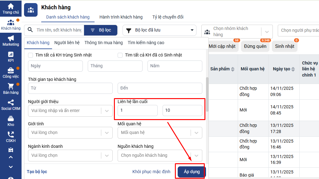 Hướng dẫn lọc các khách hàng có ngày liên hệ lần cuối từ A ngày đến B ngày trên CRM