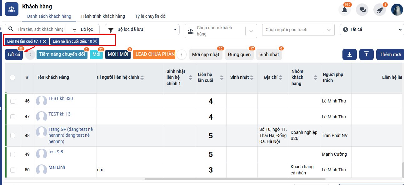 Kết quả hệ thống sẽ lọc ra các khách hàng có liên hệ lần cuối trong khoảng 1 đến 10 mà bạn cần tìm kiếm