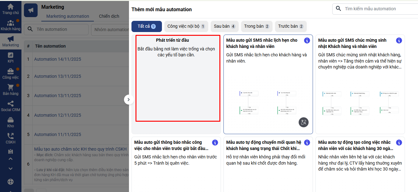 Bước 1: Các bạn chọn biểu tượng Marketing => Marketing Automation => thêm mới =>Phát triển từ đầu