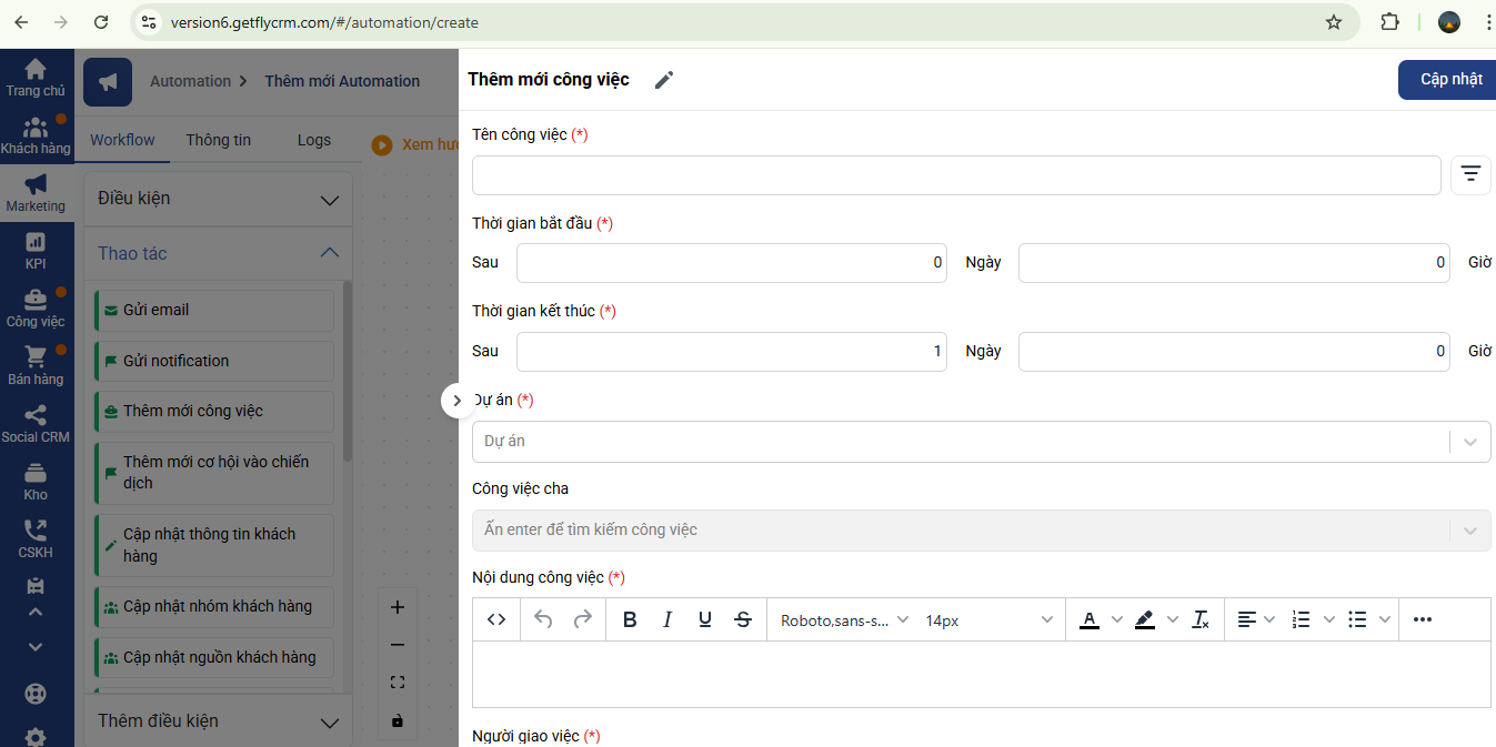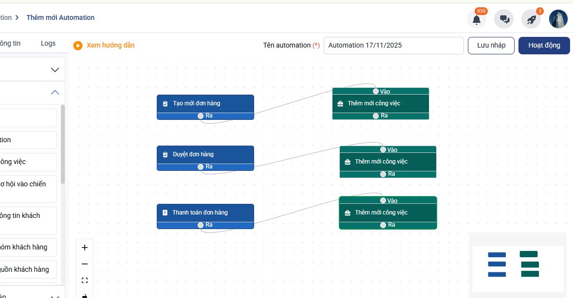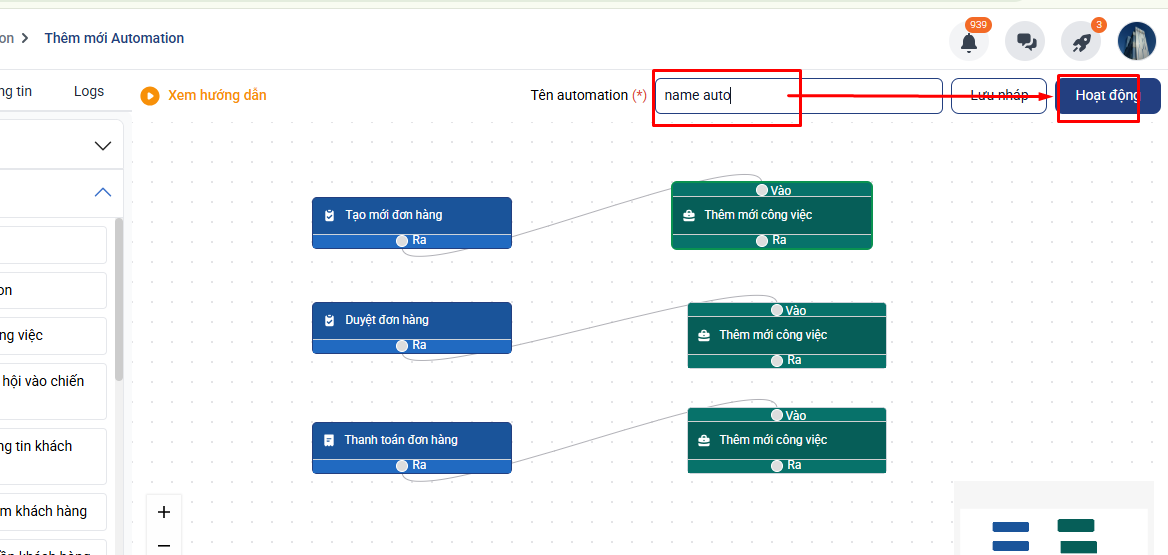 Hướng dẫn kịch bản automation tạo mới công việc nhắc nhở nhân viên khi tạo mới, duyệt, thanh toán đơn hàng trên CRM 6.0