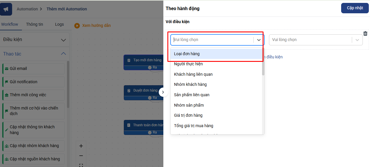 + Hành động liên quan đến đơn hàng: Bạn có thể lựa chọn các điều kiện như loại đơn hàng, Người thực hiện, Nhóm khách hàng ..vv
