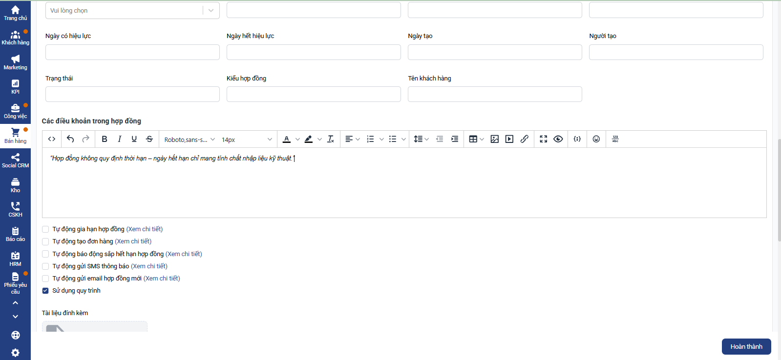 - Hỗ trợ nhắc lịch gia hạn/tái ký hợp đồng (nếu doanh nghiệp áp dụng) và thiết lập automation với điều kiện “Số ngày còn lại của hợp đồng”