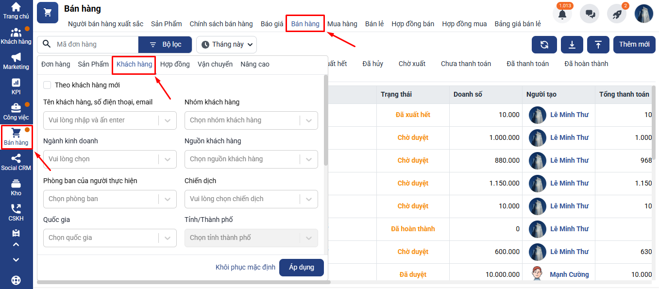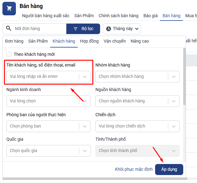 Truy cập Bán hàng → Bộ lọc → Khách hàng
