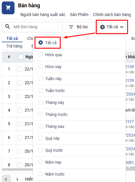- Bộ lọc hoạt động dựa trên lịch sử đơn hàng đã được tạo trong module Bán hàng.