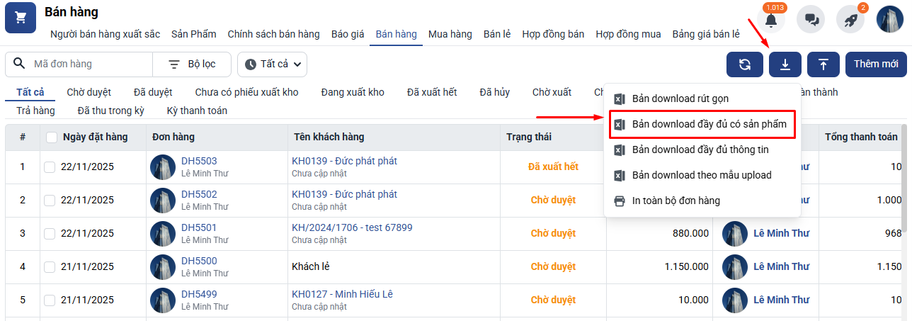 Sau khi danh sách đơn hàng được hiển thị, chọn Tải xuống (bản có sản phẩm) để xuất file chứa thông tin sản phẩm mà khách hàng đã mua.