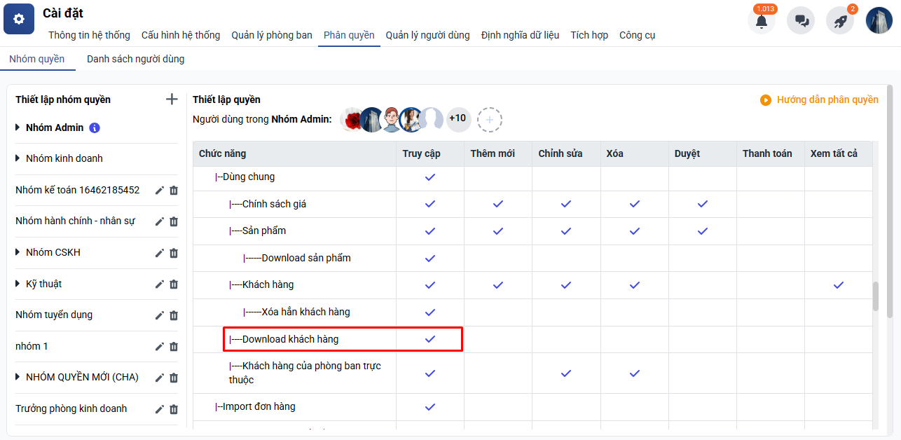 Để download danh sách khách hàng xuống, bạn phải được phân quyền" Download khách hàng"