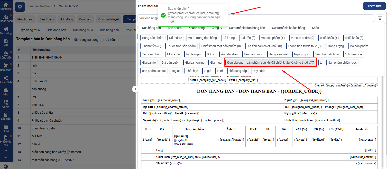Bạn vào Cài đặt → Cấu hình hệ thống → Cấu hình CRM → Template bản in → bạn chọn bản in đơn hàng bán