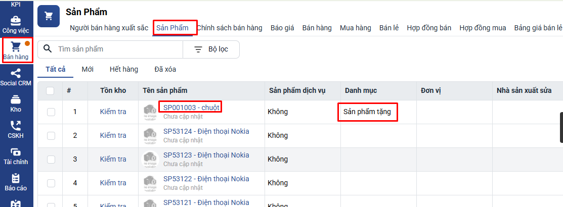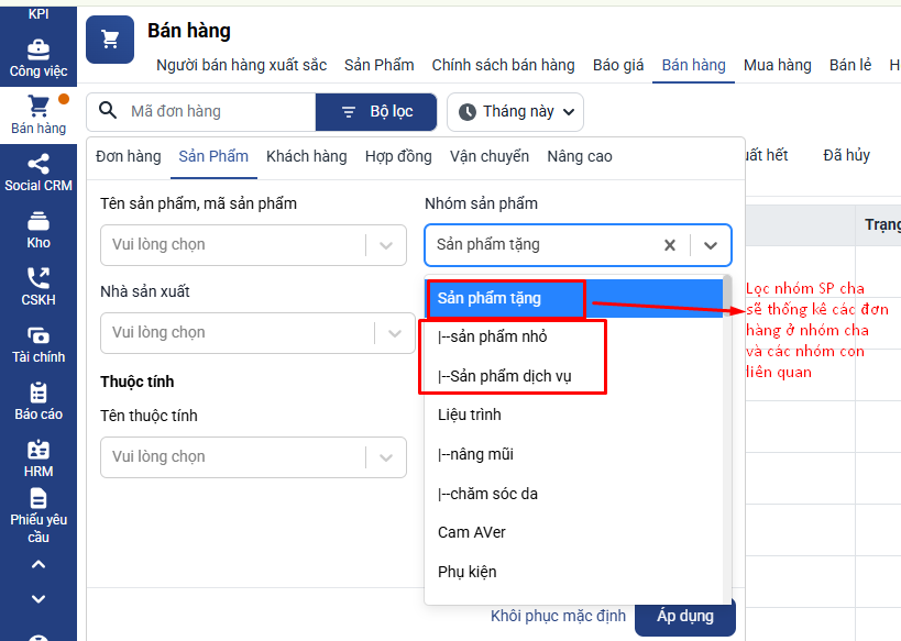 Tuy nhiên, tại Getfly CRM, hệ thống cho phép khai báo nhóm sản phẩm theo dạng nhóm cha – nhóm con. Điều này có thể dẫn đến sự hiểu nhầm khi lọc, nếu người dùng không nắm rõ cách hoạt động của bộ lọc “Nhóm sản phẩm”.