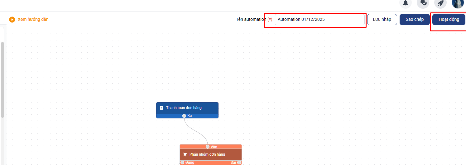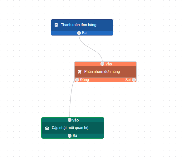 - Nối ra của thanh toán đơn hàng với vào của phân nhóm đơn hàng, nối đúng của phân nhóm đơn hàng với vào của cập nhật mối quan hệ