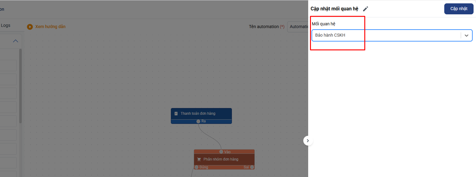 Hướng dẫn tạo kịch bản Automation: Tự động chuyển mối quan hệ khách sang “Bảo hành CSKH” khi đơn hàng được thanh toán hết trên Getfly 6.0