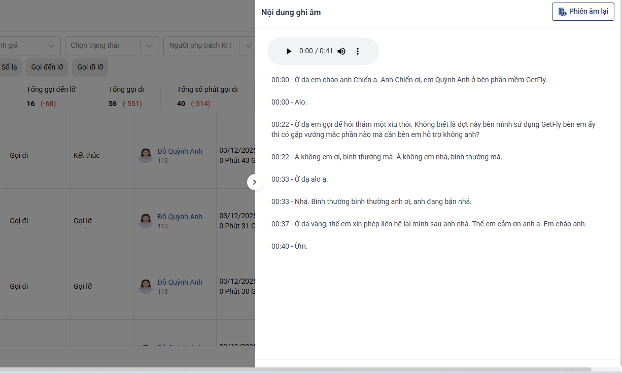 → GIẢI PHÁP: Với sự tích hợp của AI Transcript, Getfly CRM đã mang đến một giải pháp đột phá. Toàn bộ nội dung cuộc gọi được AI chuyển thành văn bản (Text) một cách tự động, kèm theo mốc thời gian cụ thể của từng lời thoại.