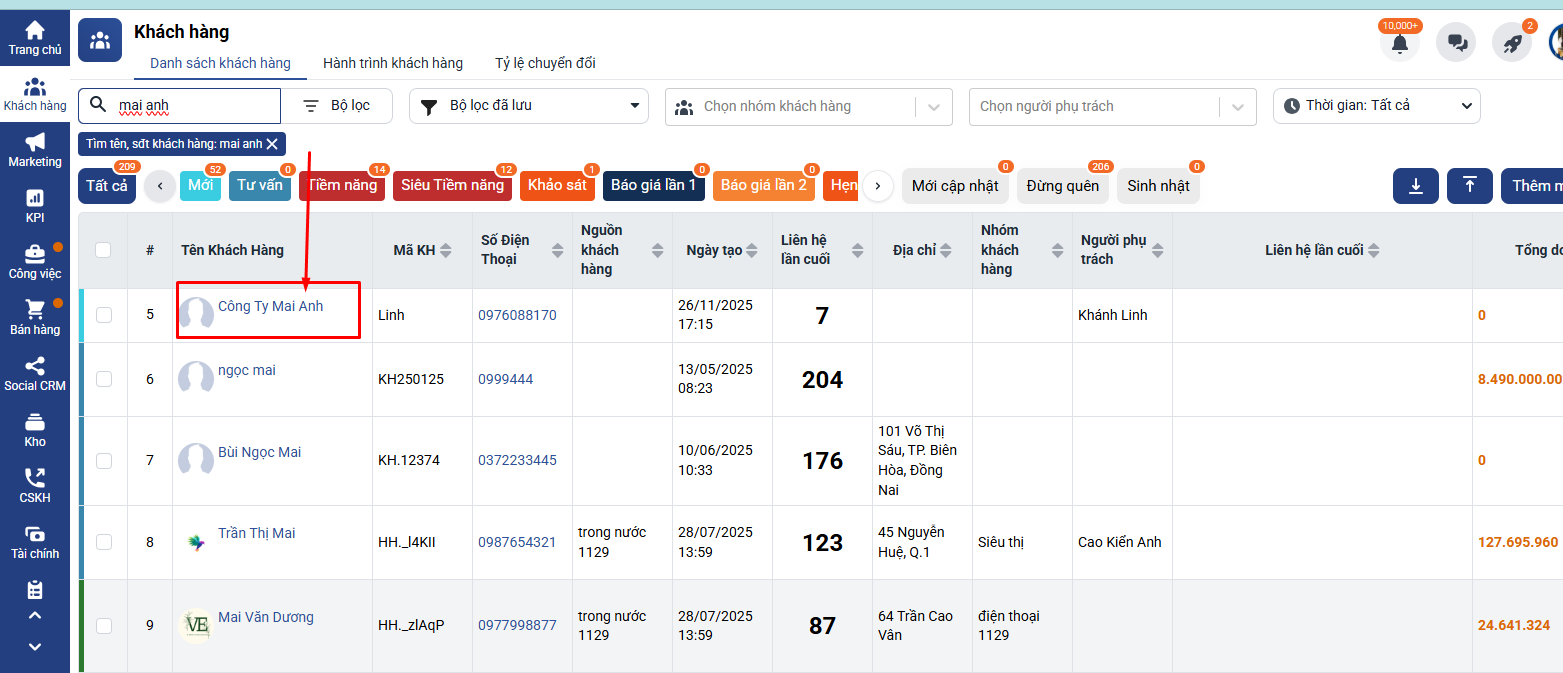 Từ Menu chính, chọn Khách Hàng, sau đó tìm và click vào Tên Khách Hàng.