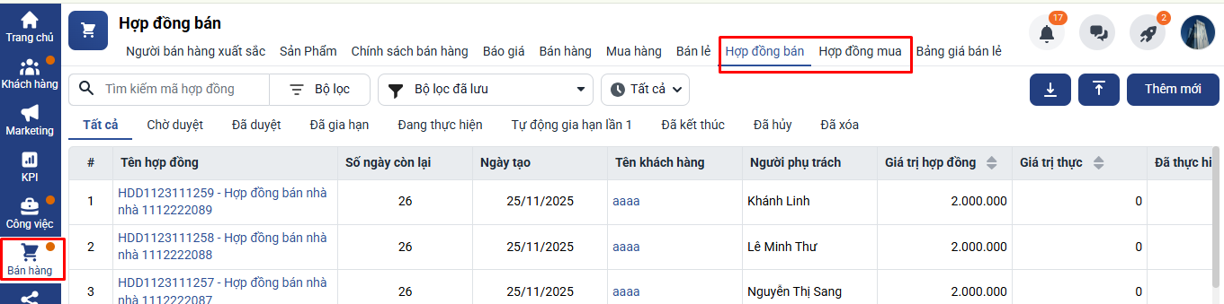 - Nhầm loại hợp đồng: hợp đồng được tạo là HĐ mua nhưng người cần xem đang tìm theo module HĐ bán (hoặc ngược lại) — dẫn tới không tìm/hiển thị đúng vị trí.