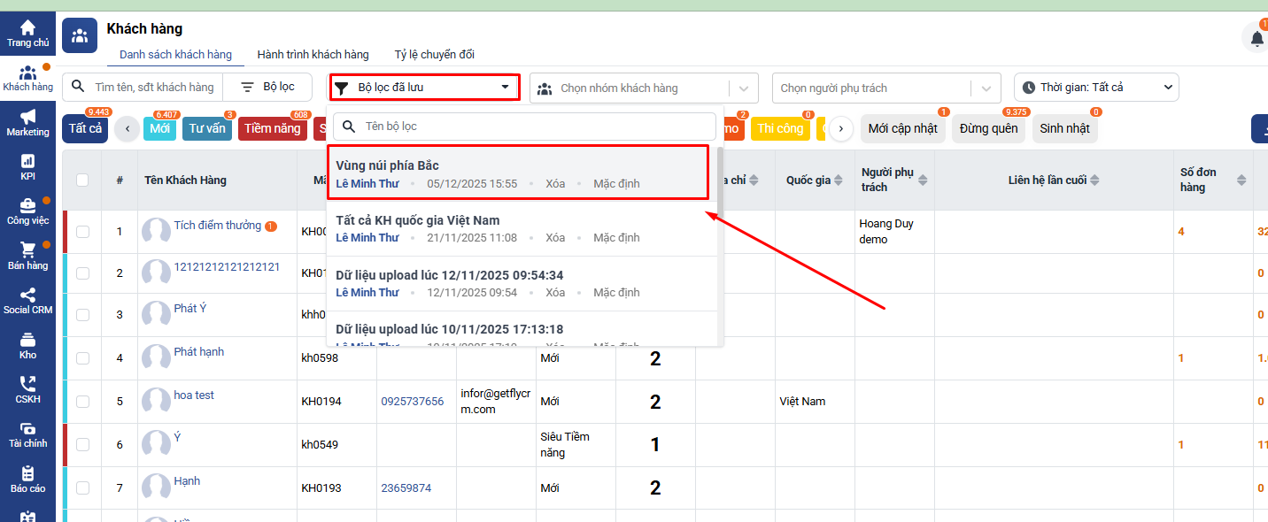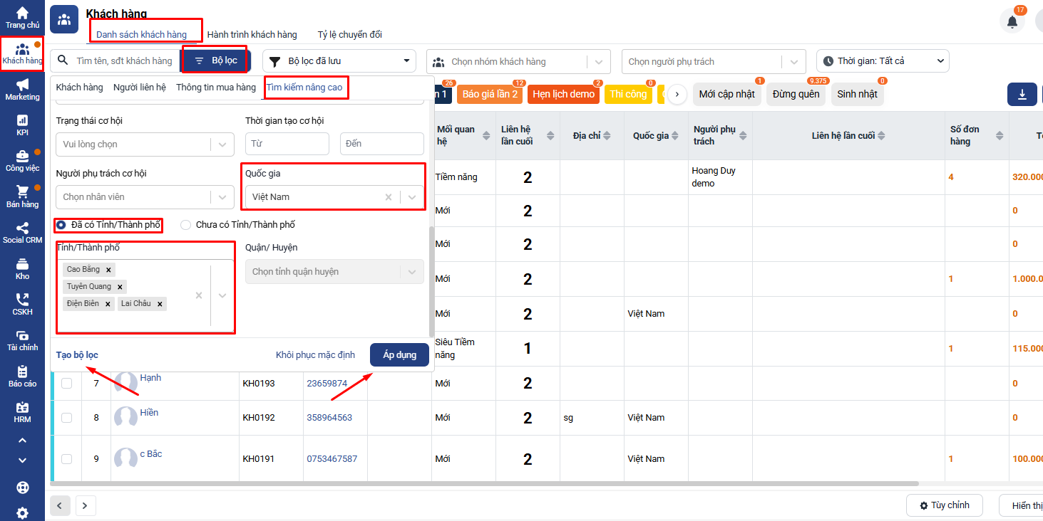 - Khách hàng → Danh sách khách hàng → Bộ lọc → Tìm kiếm nâng cao