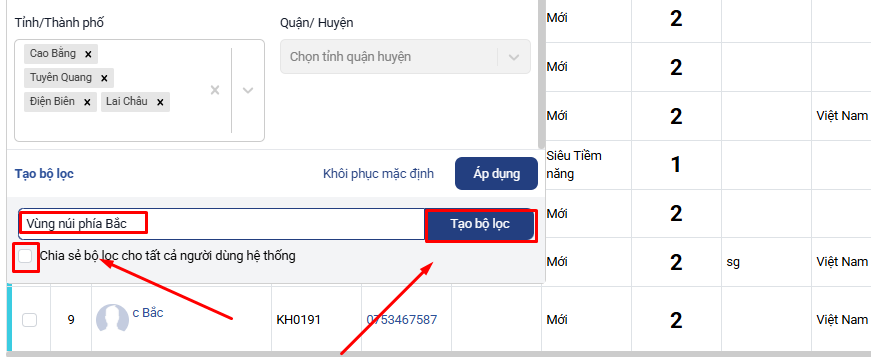 Bước 2: Tạo bộ lọc → Đặt tên bộ lọc “Miền” Bắc / Trung / Nam để sau này tiện lọc lại