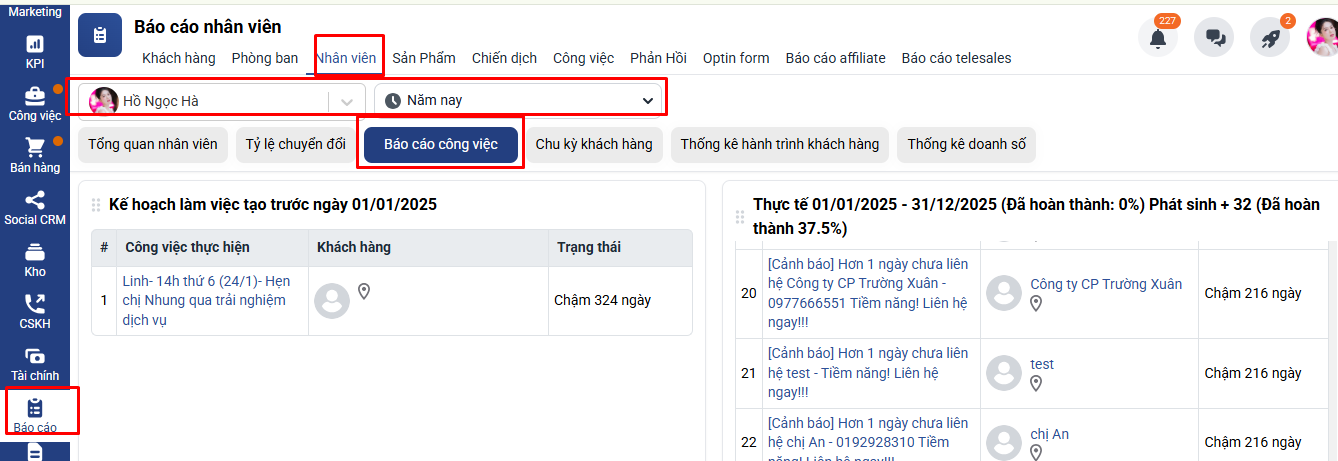 Bước 1: Truy cập báo cáo Nhân viên → Chọn tài khoản nhân viên cần theo dõi và Thời gian cần theo dõi → Sau đó chọn Báo cáo công việc
