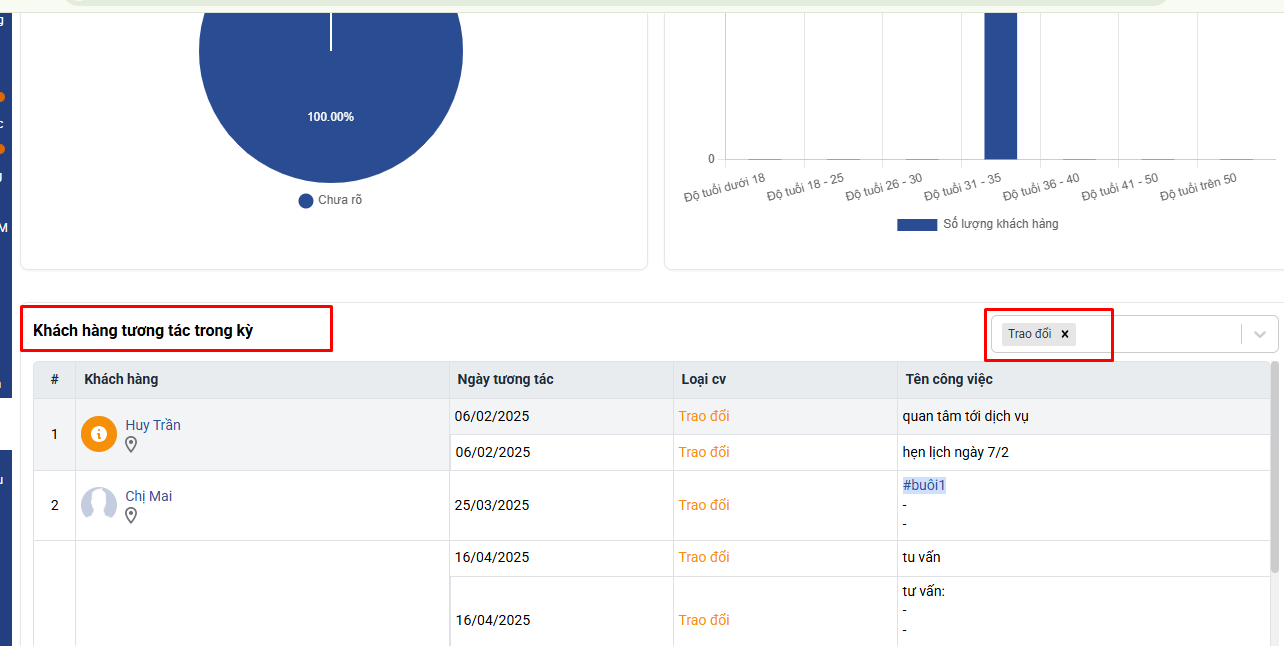 Bước 2: Mở báo cáo Công việc → Khách hàng tương tác trong kỳ → Chọn loại tương tác là Trao đổi