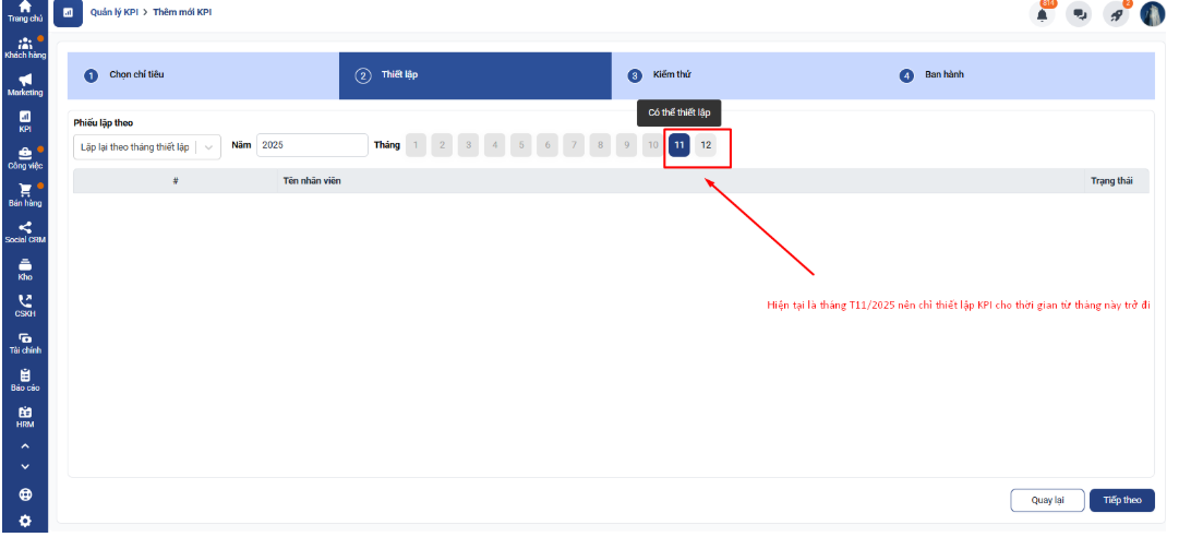 - CRM không hỗ trợ áp dụng KPI ngược về các tháng đã qua, bao gồm tháng 11 hoặc những tháng trước đó.