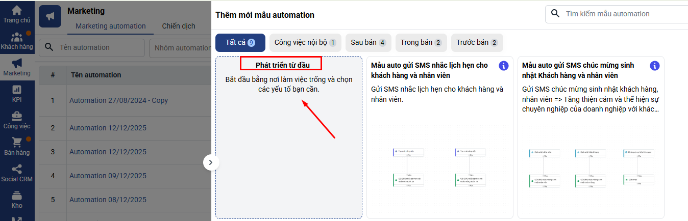 Bước 1: Vào marketing -> chọn MKT automation -> Thêm mới -> Phát triển từ đầu
