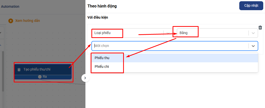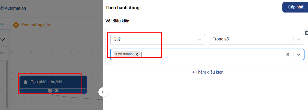 + Hành động: Tạo phiếu thu/chi: Bạn có thể chọn điều kiện là loại phiếu thu hay phiếu chi. Hoặc cả 2 loại phiếu thu chi nhưng áp dụng cho các Quỹ tương ứng