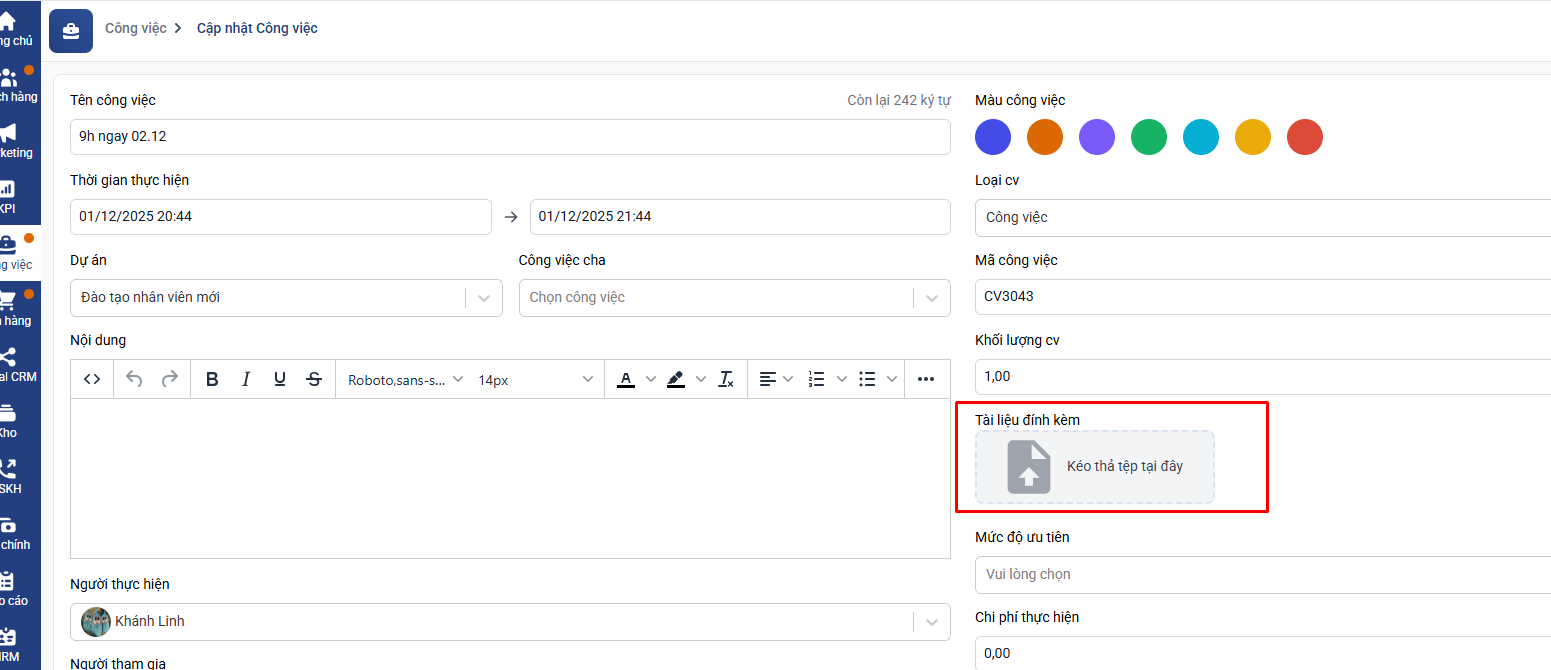- Khi tạo mới hoặc chỉnh sửa Công việc, người dùng có thể đính kèm file (PDF, Excel, Word…) của Báo giá hoặc Đơn hàng vào mục Tài liệu đính kèm.