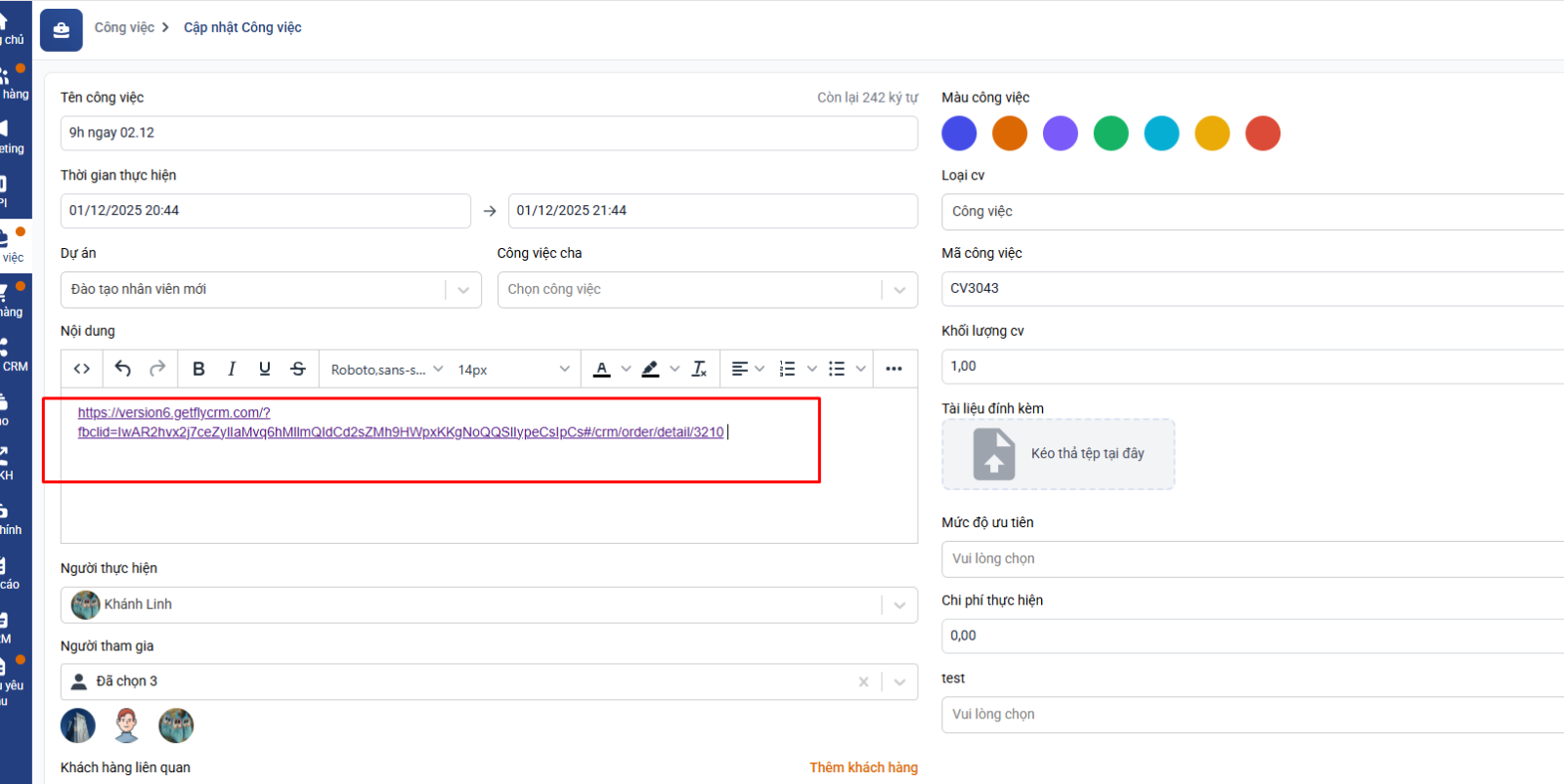Cách 2. Gắn link Báo giá hoặc Đơn hàng vào nội dung Công việc