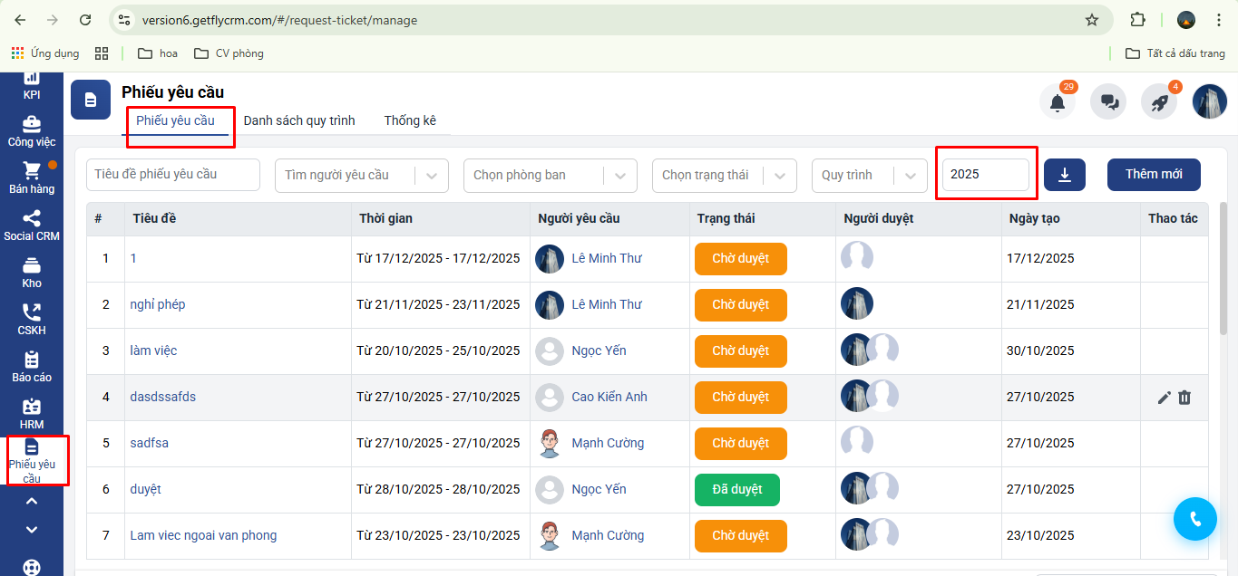 Nhân viên thực hiện tạo phiếu yêu cầu nghỉ phép có thời gian năm khác thời gian năm hiện tại ( ví dụ năm hiện tại đang là 2025, nhưng nhân sự tạo phiếu nghỉ năm 2026) trên hệ thống Getfly CRM.