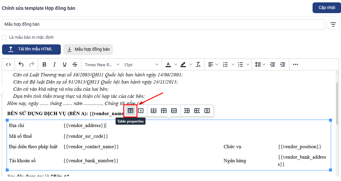 Truy cập Cài đặt → Cấu hình CRM → Template bản in → Chọn mẫu tempalte cần chỉnh sửa → Chọn bảng cần kiểm tra → Chọn Table properties