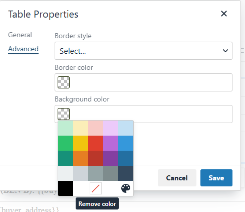 Trong bảng Table Properties → Chọn Border style: Select; Border color: / (Remove color) ; Background color: / (Remove color) → Save.
