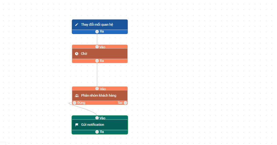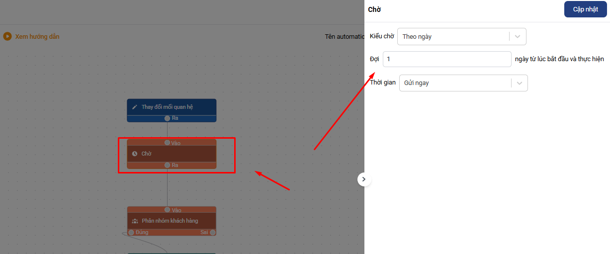 - Thiết lập Hành động chờ: Chờ 1 / 2 / 3 ngày (tùy theo quy trình chăm sóc của doanh nghiệp)