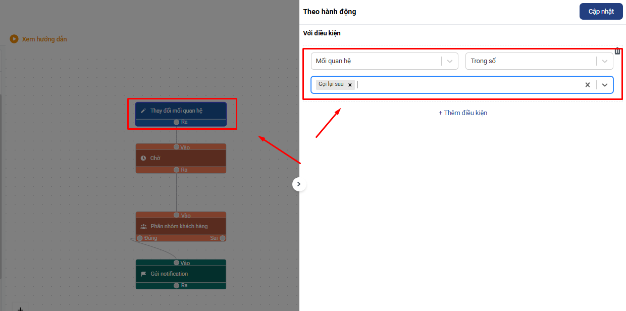 - Thiết lập Điều kiện kích hoạt: Mối quan hệ khách hàng thay đổi thành “Chưa liên hệ được”.