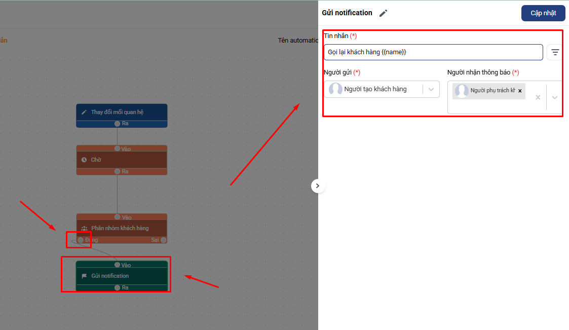 - Thiết lập Hành động tiếp theo: Gửi Thông báo cho Sale phụ trách Hoặc tạo Công việc nhắc gọi lại khách hàng