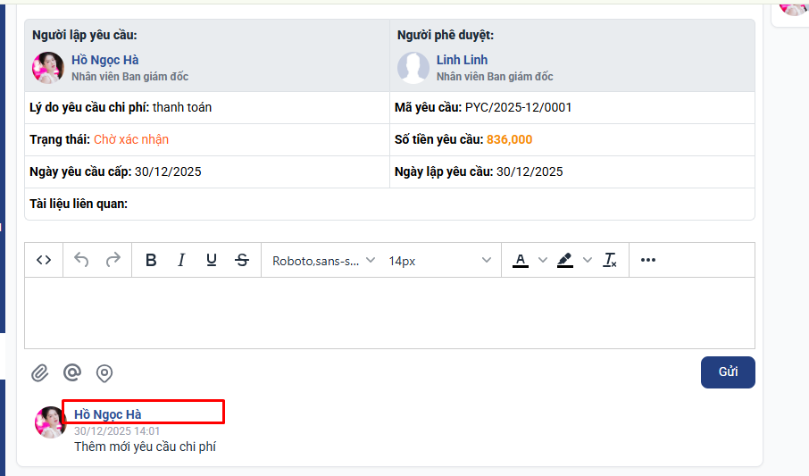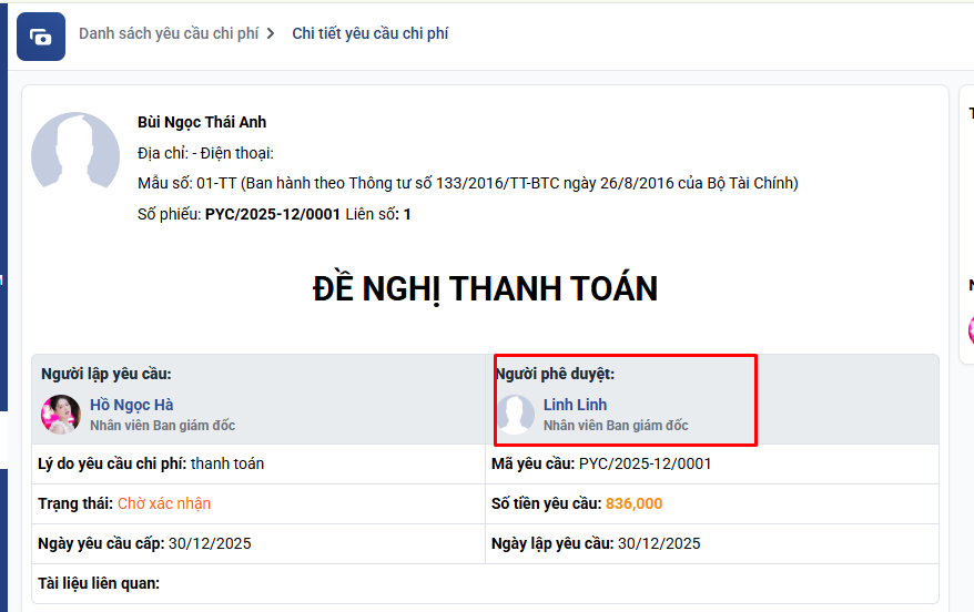 2.4. Người có chức vụ cao nhất trong một phòng ban sẽ xem được yêu cầu chi phí của nhân viên cấp dưới tạo: