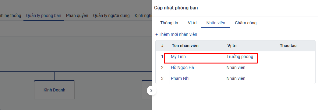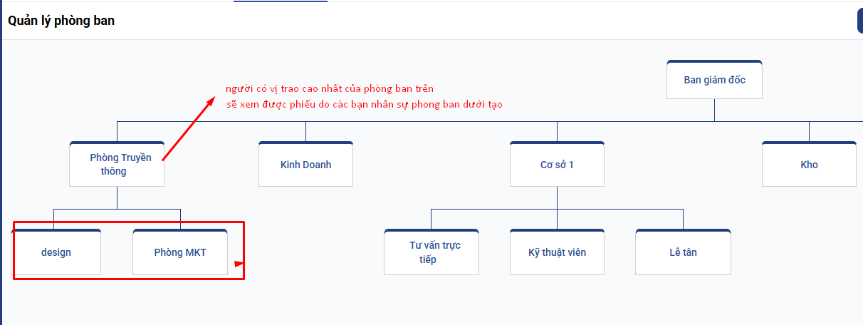 Ví dụ: Tài khoản A là trưởng phòng - Người có chức vụ cao nhất trong phòng bán hàng sẽ xem được các yêu cầu chi phí của nhân viên cấp dưới