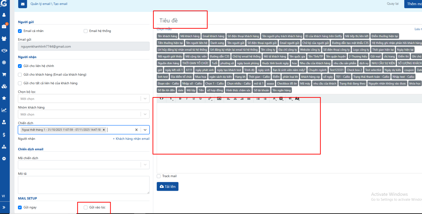 Bước 3: Nhập tiêu đề và nội dung email. Thiết lập hẹn giờ gửi (nếu cần)