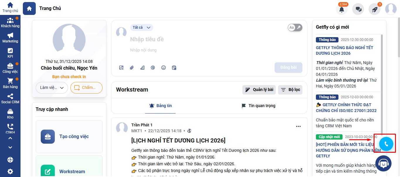 Cụ thể: nút gọi chỉ hiển thị với các tài khoản đã được phân quyền truy cập Call Center. Các tài khoản không được phân quyền Call Center sẽ không hiển thị icon gọi trên hệ thống.