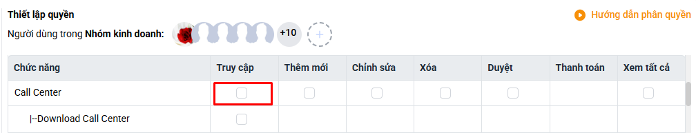 Trường hợp nếu không muốn hiển thị lên nút gọi nhanh thì có thể bỏ tích phân quyền truy cập Call Center của tài khoản.