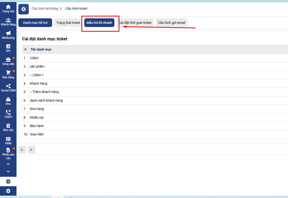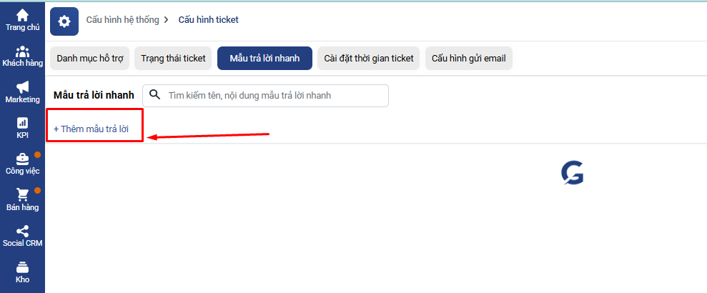 Bước 3: Tại màn hình cấu hình ticket, chọn tab Mẫu trả lời nhanh.