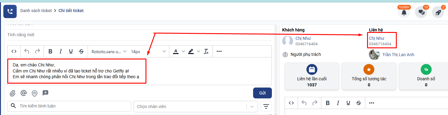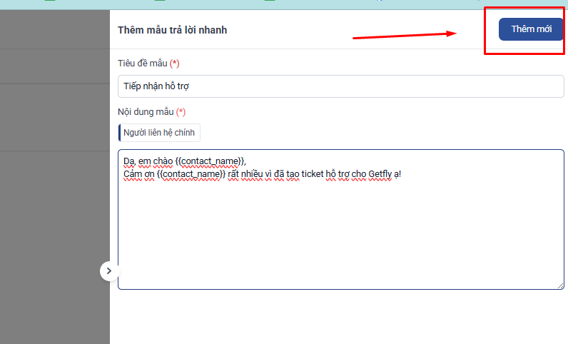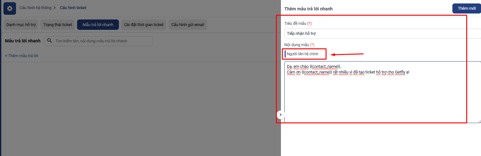 Biến {{contact_name}} sẽ tự động hiển thị tên liên hệ khách hàng ( người tạo ticket ) khi gửi phản hồi.
